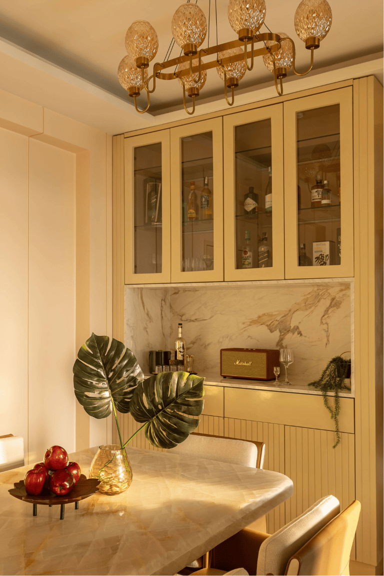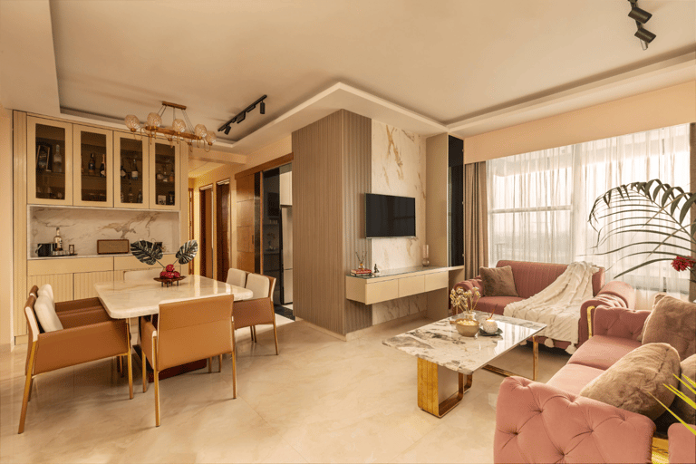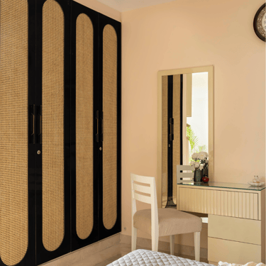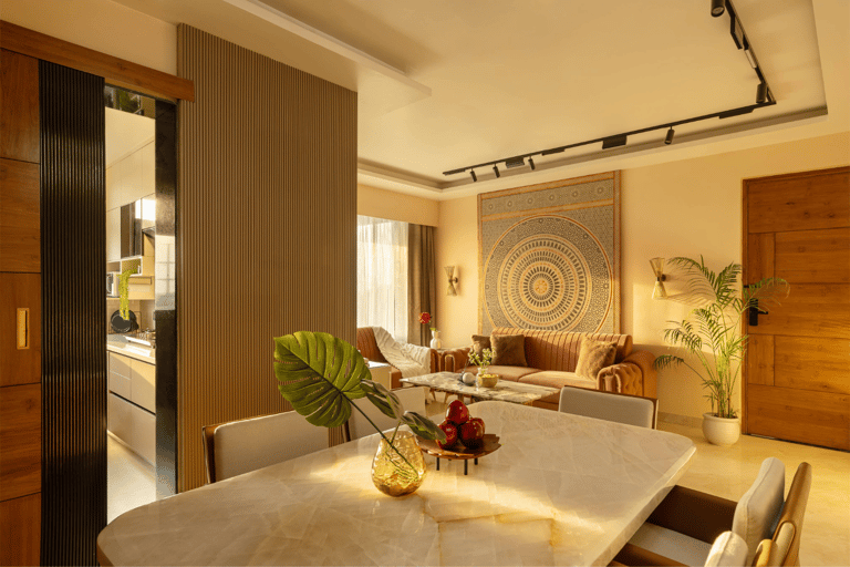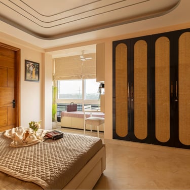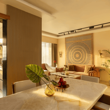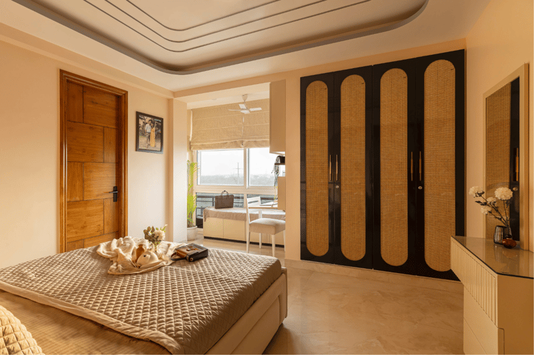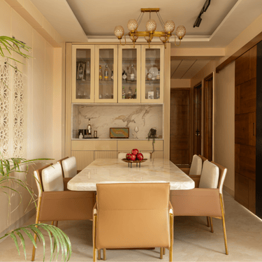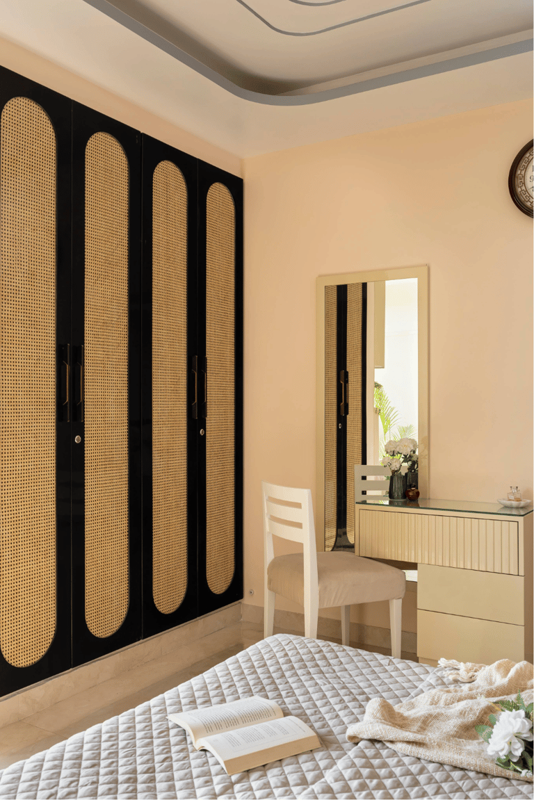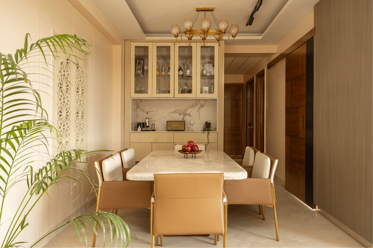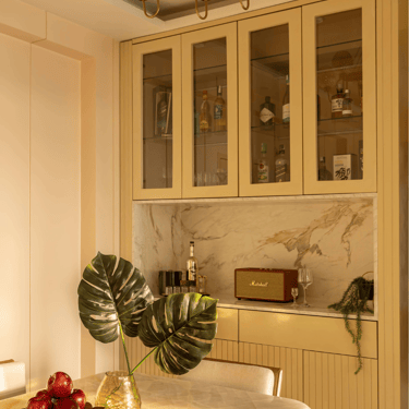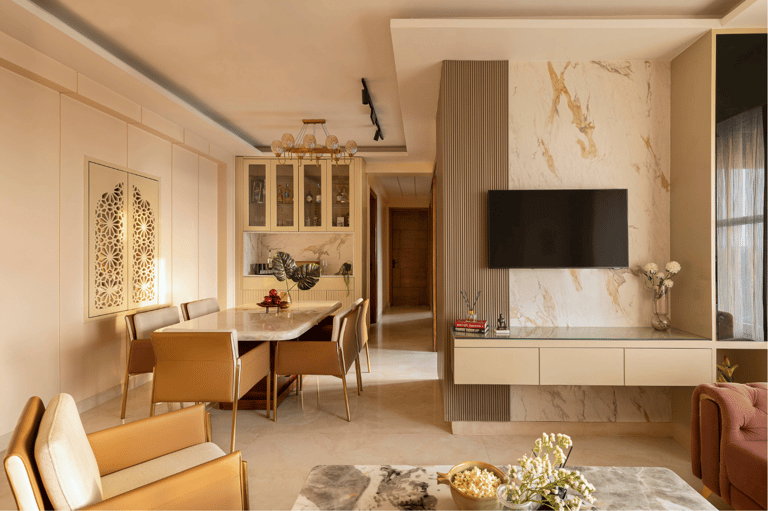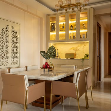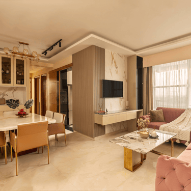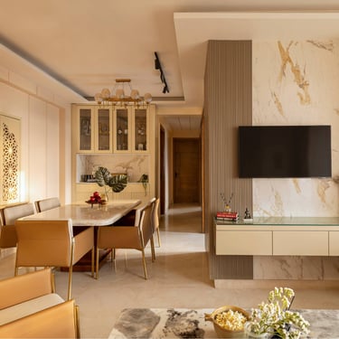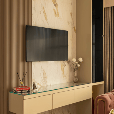 The design journey for this home began with addressing its primary challenge — limited natural light despite a favourable orientation. Large windows were introduced to invite daylight into the interiors, transforming the atmosphere and creating a brighter, more uplifting living environment. The overall palette embraces calm neutral tones complemented by natural textures such as rattan, reflecting the client’s desire for a home that feels closely connected to nature. A mural feature wall in the living space adds a serene focal point, while the onyx and marble surfaces subtly interact with natural light to create warmth and depth. Thoughtfully designed and intentionally clutter-free, the home balances elegance with comfort, allowing each space to feel open, calm, and effortlessly inviting.