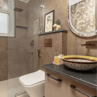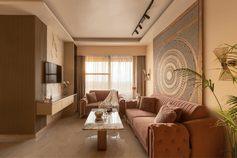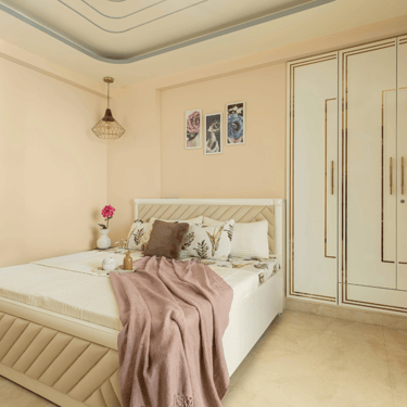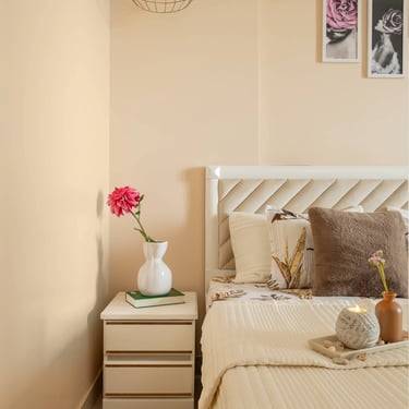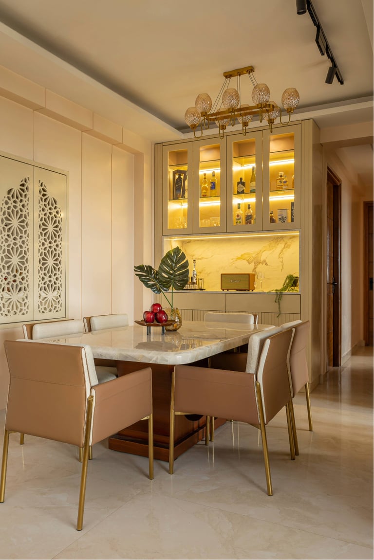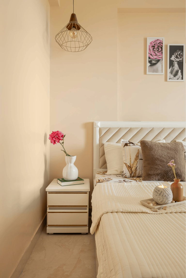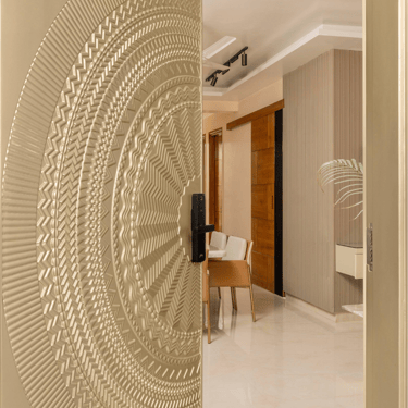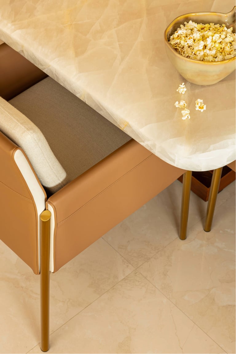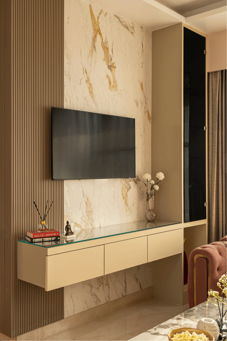 The design journey for this home began with addressing its primary challenge — limited natural light despite a favourable orientation. Large windows were introduced to invite daylight into the interiors, transforming the atmosphere and creating a brighter, more uplifting living environment. The overall palette embraces calm neutral tones complemented by natural textures such as rattan, reflecting the client’s desire for a home that feels closely connected to nature. A mural feature wall in the living space adds a serene focal point, while the onyx and marble surfaces subtly interact with natural light to create warmth and depth. Thoughtfully designed and intentionally clutter-free, the home balances elegance with comfort, allowing each space to feel open, calm, and effortlessly inviting.