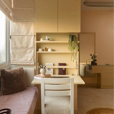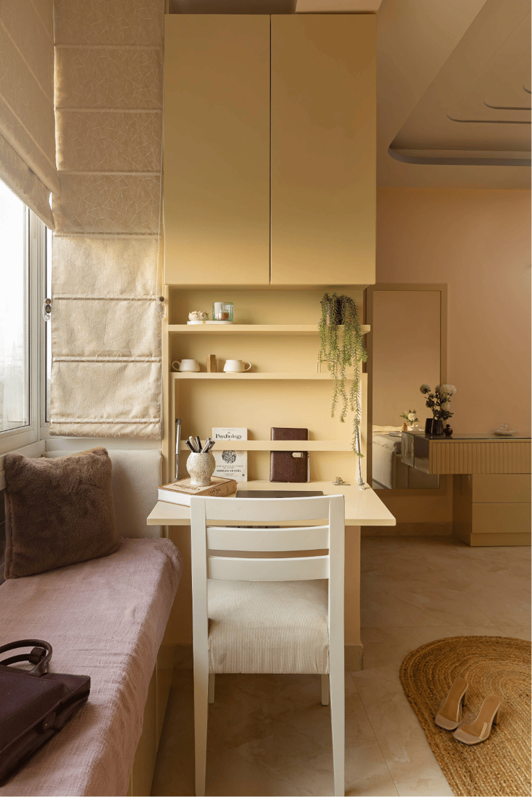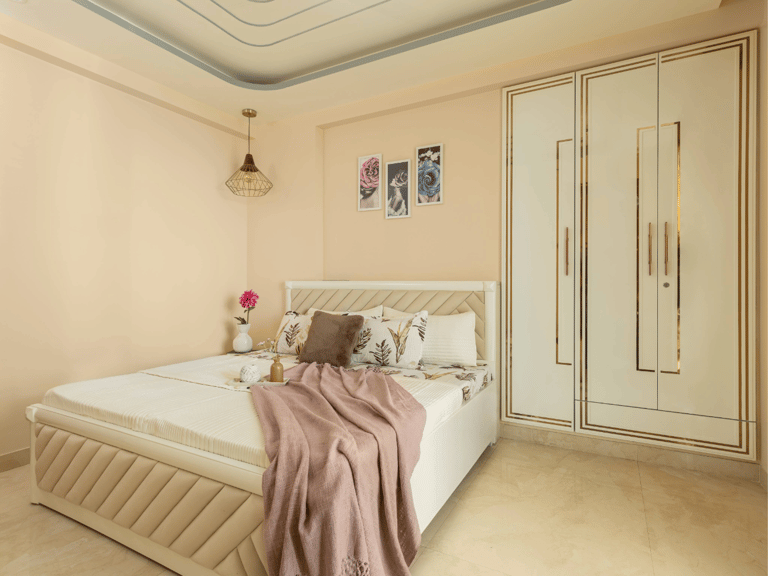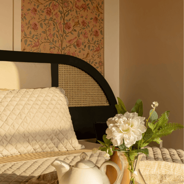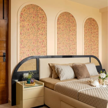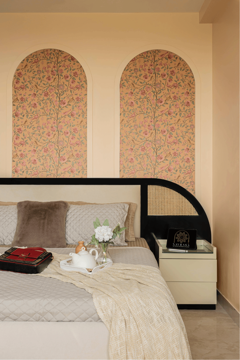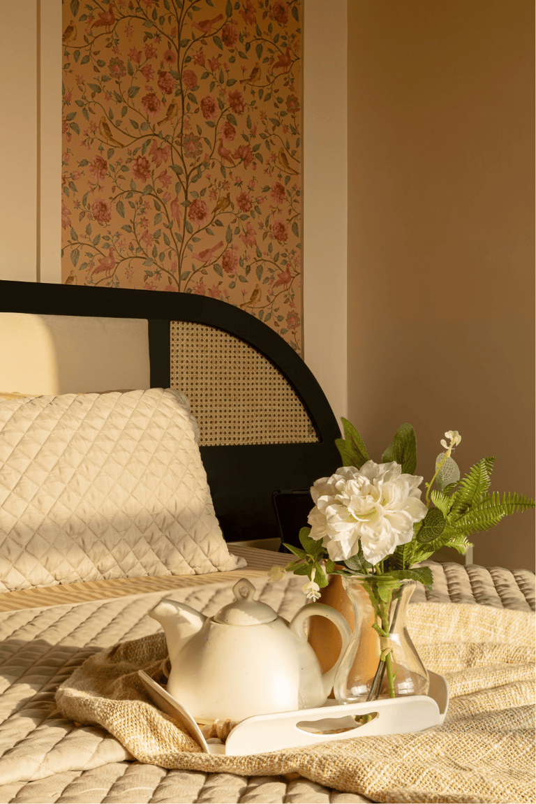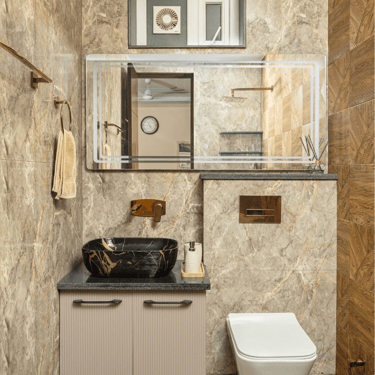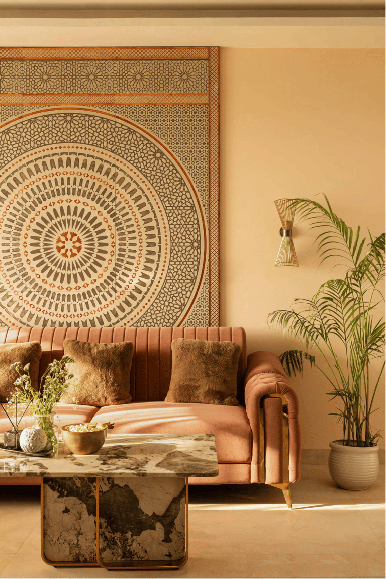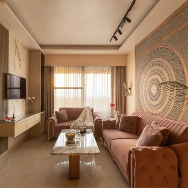The design journey for this home began with addressing its primary challenge — limited natural light despite a favourable orientation. Large windows were introduced to invite daylight into the interiors, transforming the atmosphere and creating a brighter, more uplifting living environment. The overall palette embraces calm neutral tones complemented by natural textures such as rattan, reflecting the client’s desire for a home that feels closely connected to nature. A mural feature wall in the living space adds a serene focal point, while the onyx and marble surfaces subtly interact with natural light to create warmth and depth. Thoughtfully designed and intentionally clutter-free, the home balances elegance with comfort, allowing each space to feel open, calm, and effortlessly inviting.